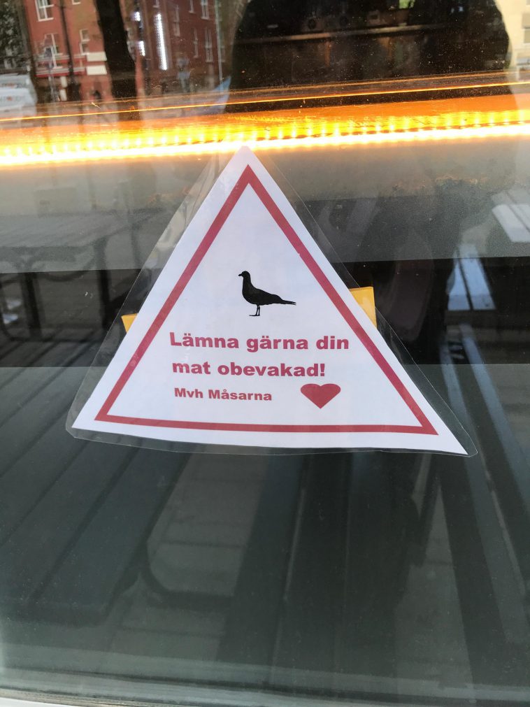 Kära besökare, vi vill informera er om att våra lokala måsföreningar har utropat denna plats till en officiell matkrigszon. Vi rekommenderar starkt att ni lämnar er mat obevakad och utsatt för hänsynslösa attackmåsar.