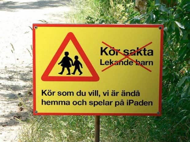 Varning lekande barn skyltar har man sett tidigare men denna var lite annorlunda. “Kör som du vill, vi är ändå hemma och spelar på iPaden” Mer